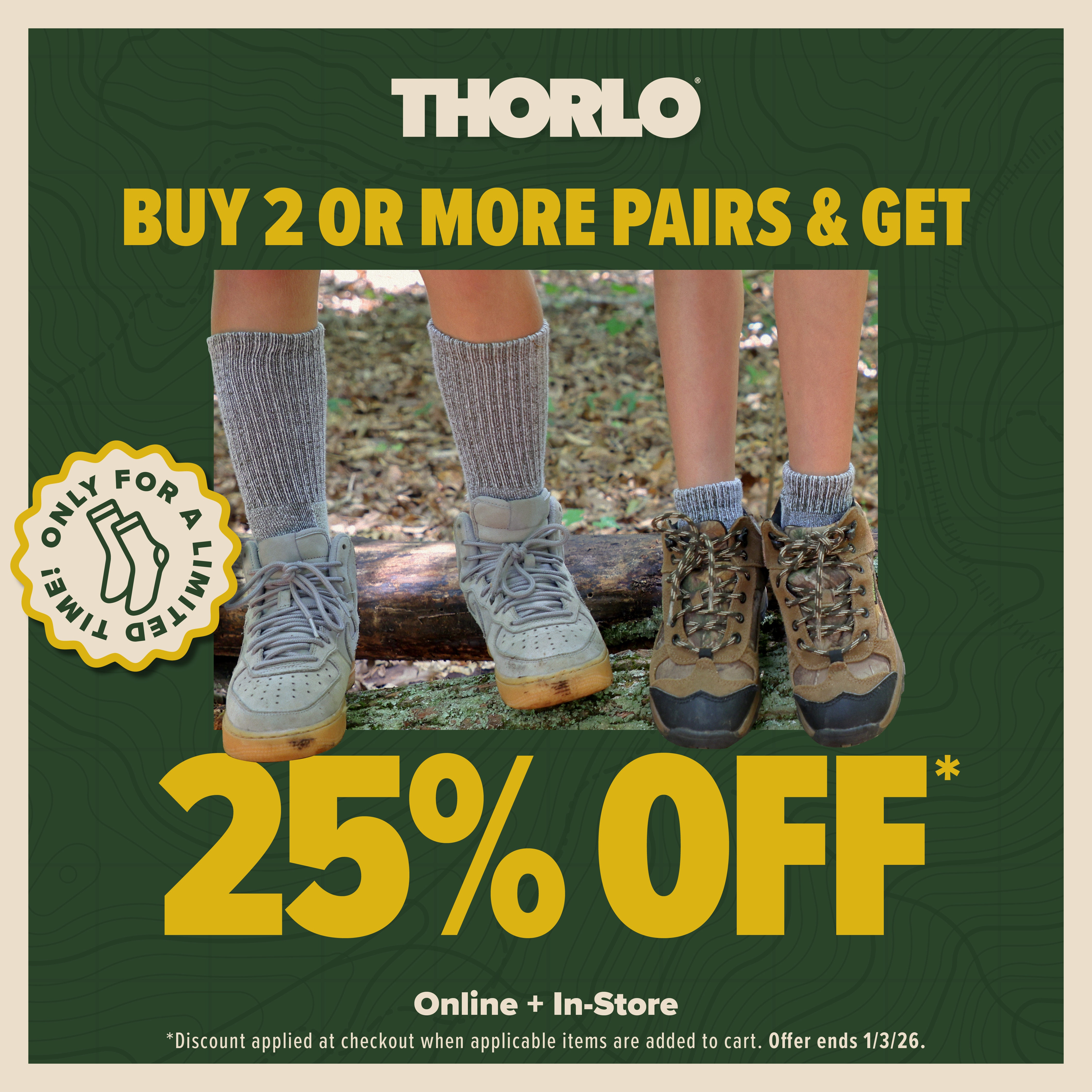 Comfort on the trail starts with the right socks, and for a limited time you can save 25% on Thorlo socks when you purchase two or more pairs. This deal is valid both online and in-store through January 3, 2026. Whether you’re planning winter camping or stocking up for next summer, now is the best time to grab this essential gear.